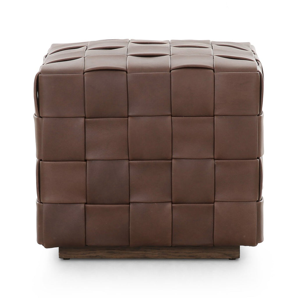 Soft, specialized top-grain leather is hand-woven, crafting a look of a treasured vintage find. Use as bonus seating or style with a tray for an extra surface.