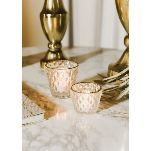 The Cristal Votive has repeating diamond shapes cut into the surface and a gold lip that enhance candlelight glow.