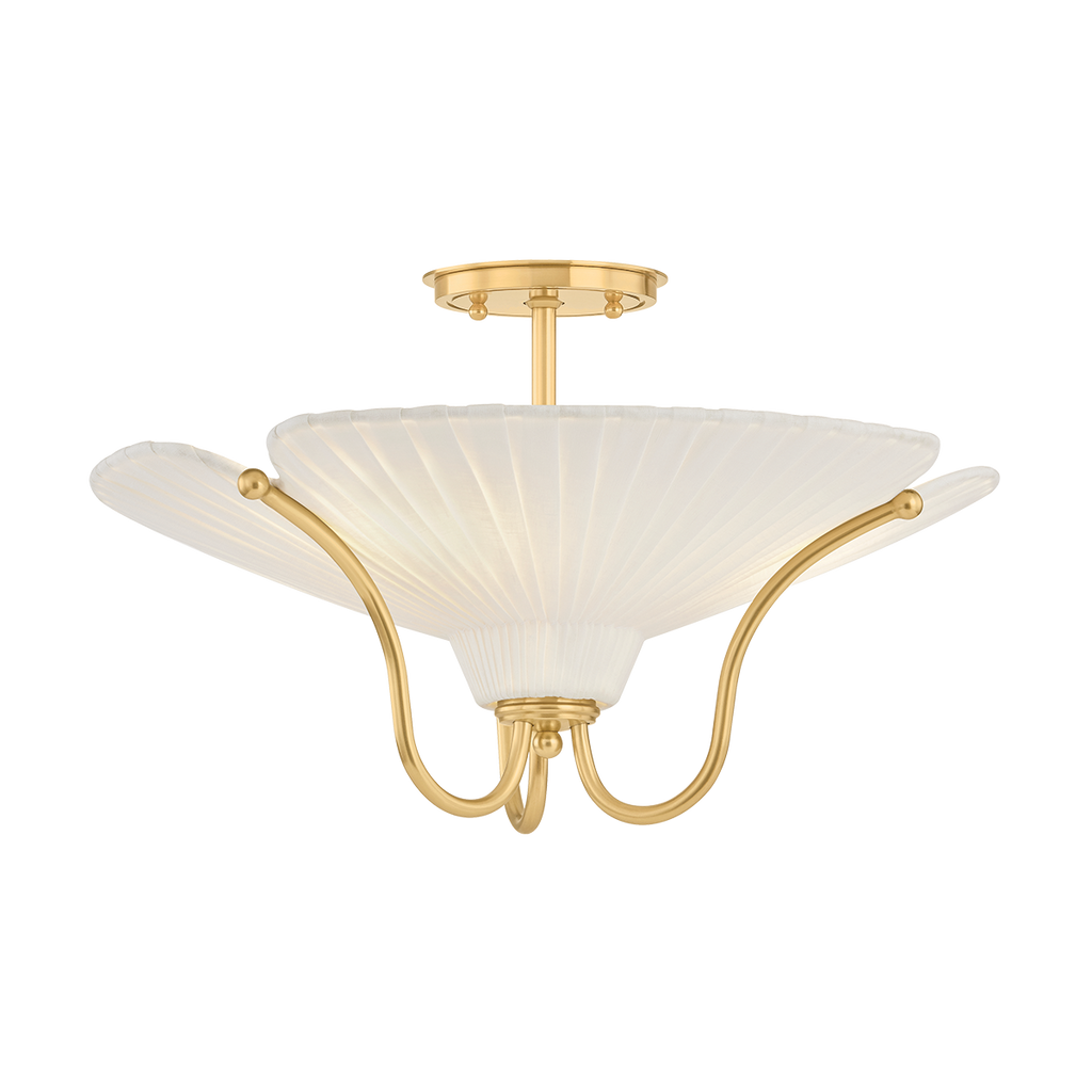 Drawing inspiration from the organic elegance of the Art Nouveau period, Gerhard reinterprets floral motifs with architectural clarity. Gracefully arched metalwork in a warm Aged Brass finish supports sheer ivory linen shades, crafted with a unique pleating technique that adds volume and dimension. Together, these elements form abstracted botanical shapes that feel both refined and expressive. Available as a semi flush mount and a 3 or 9-light pendant, this decorative up light serves as a captivating, sculptural focal point.