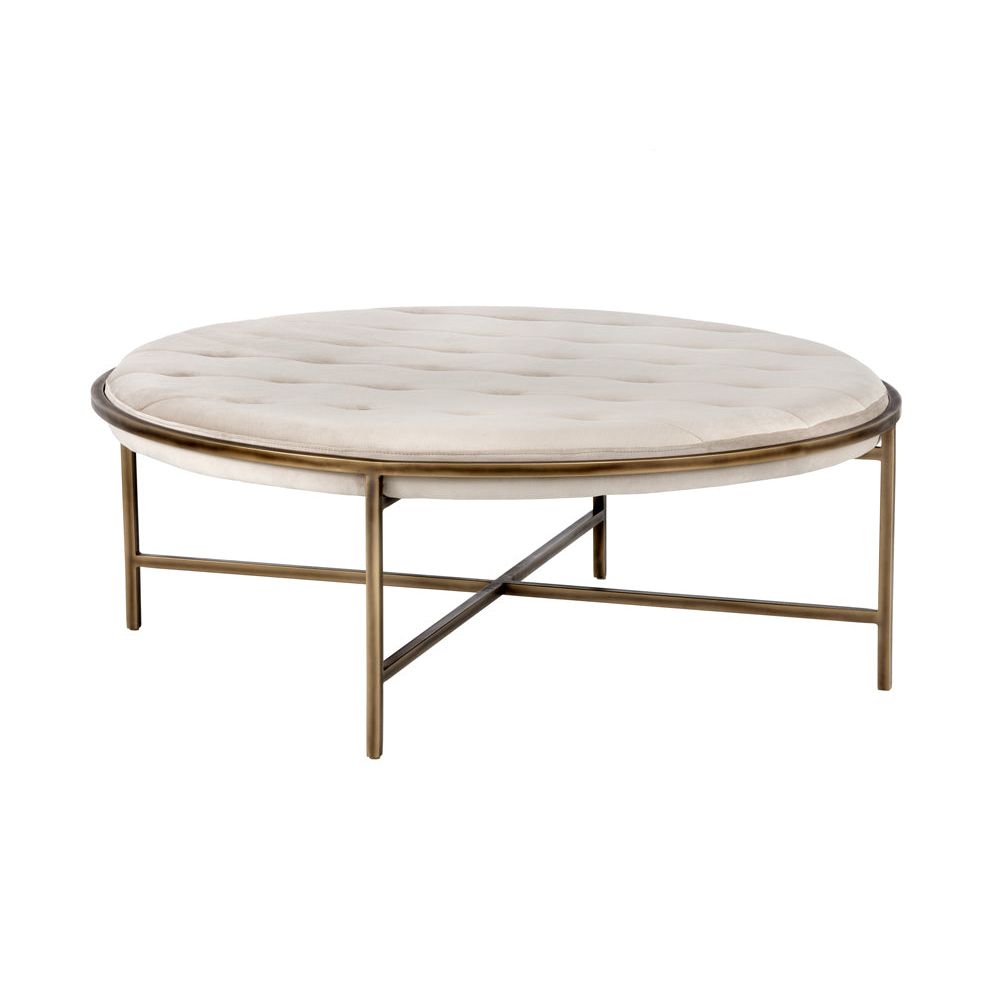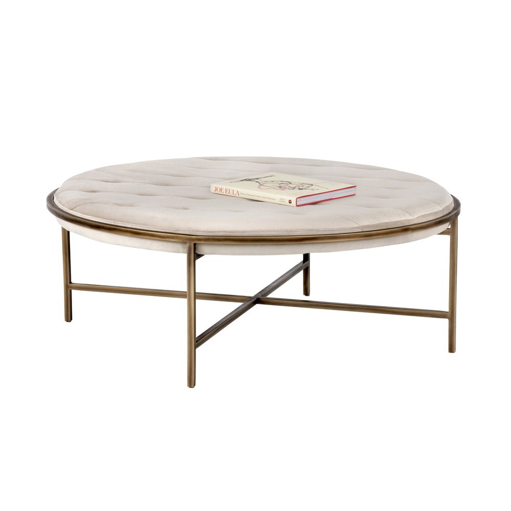 This large round ottoman exudes transitional flair. Stocked in our soft piccolo pebble and prosecco performance fabrics with a rustic bronze steel frame. Can be used as a coffee table or as extra seating in residential and commercial spaces. Performance fabric is moisture repellent, stain resistant and easy to clean.