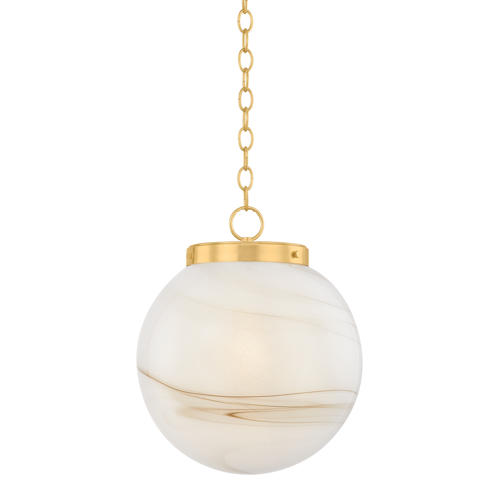 The Ambra pendant's simplistic silhouette allows its distinctive glass technique to shine. Hand-blown in Mitzi’s factory, the Cappuccino Swirl glass showcases a stunning, marbled appearance with espresso-hued striations. A classic Aged Brass fitter and chain balances the dynamic glass of this pendant. Ambra is available in two sizes.