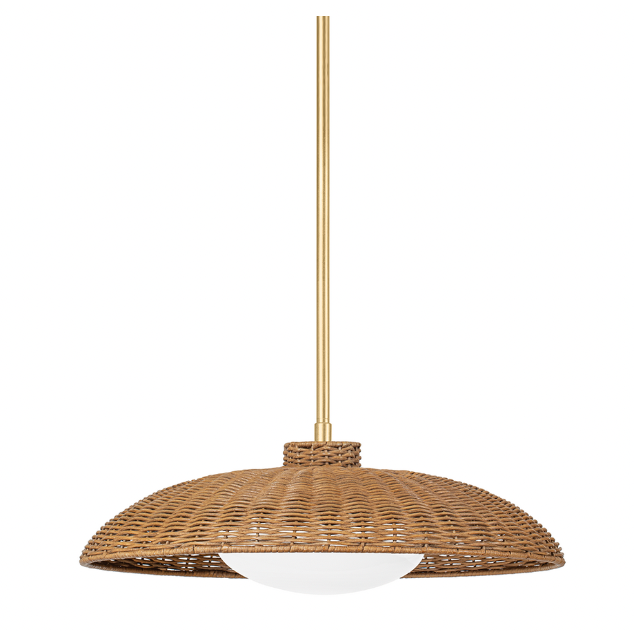 Both relaxed and refined, Delano is a natural choice to bring a sophisticated, coastal feel to any interior. A sturdy, subtly etched vintage gold leaf rod holds a warm honey rattan shade. The opal glossy glass globe fills the shade with a soft glow that also emanates throughout this hand-woven pendant.