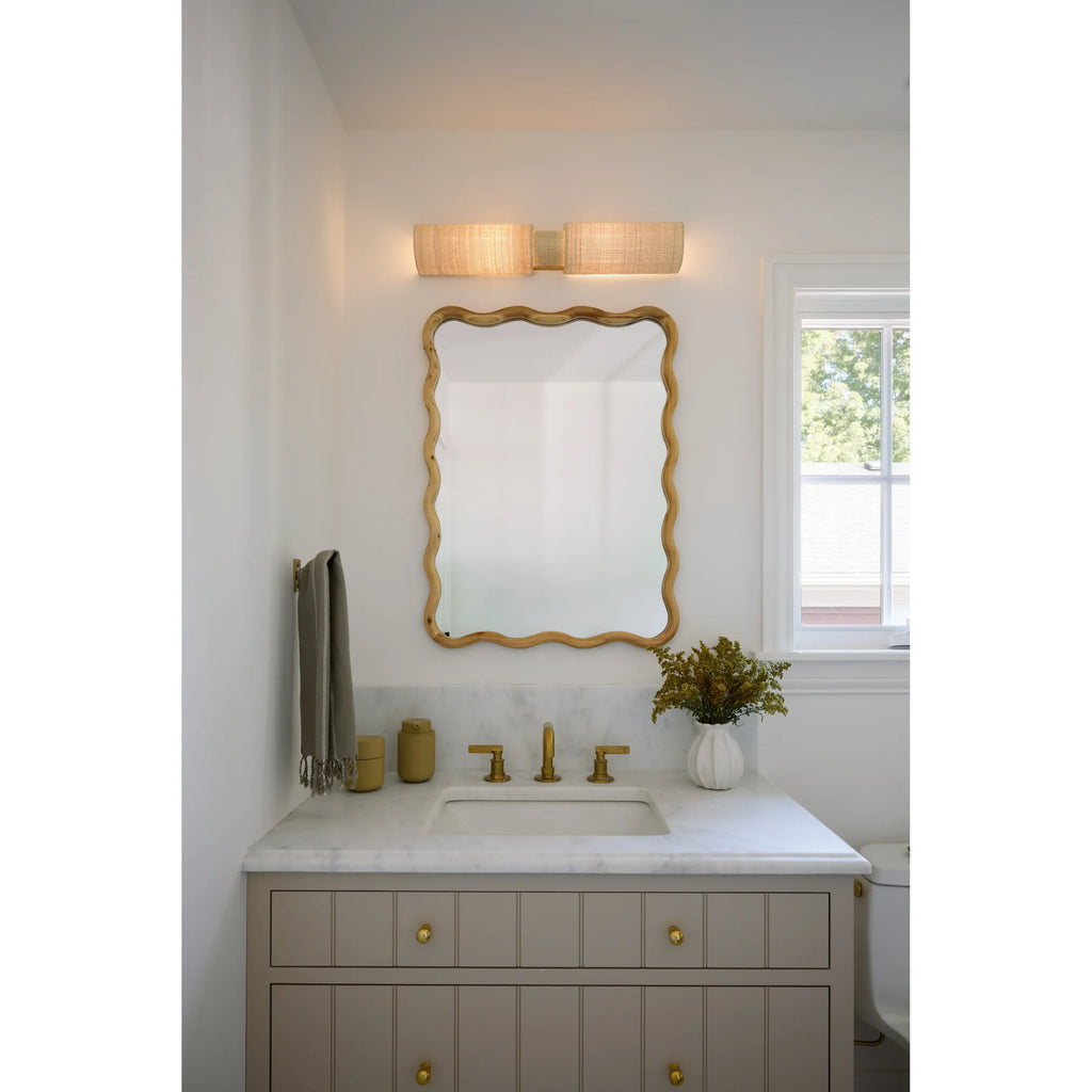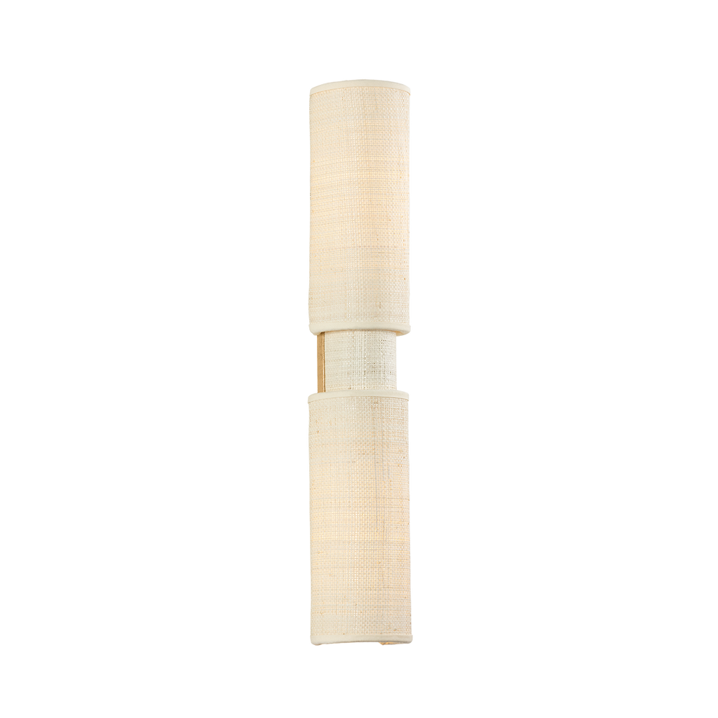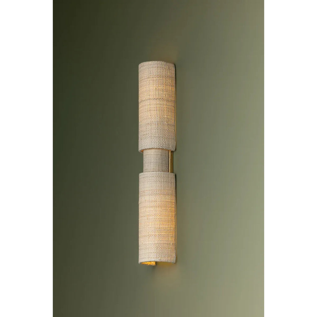 The beauty of the Ashton sconce stems from its simplified form and distinctive materiality. Woven from Saguran fabric, three cylindrical shades overlap to form areas that emit more or less light. This highly textural 2-light sconce is perfect for a bathroom or other small space as it creates a serene ambience.
