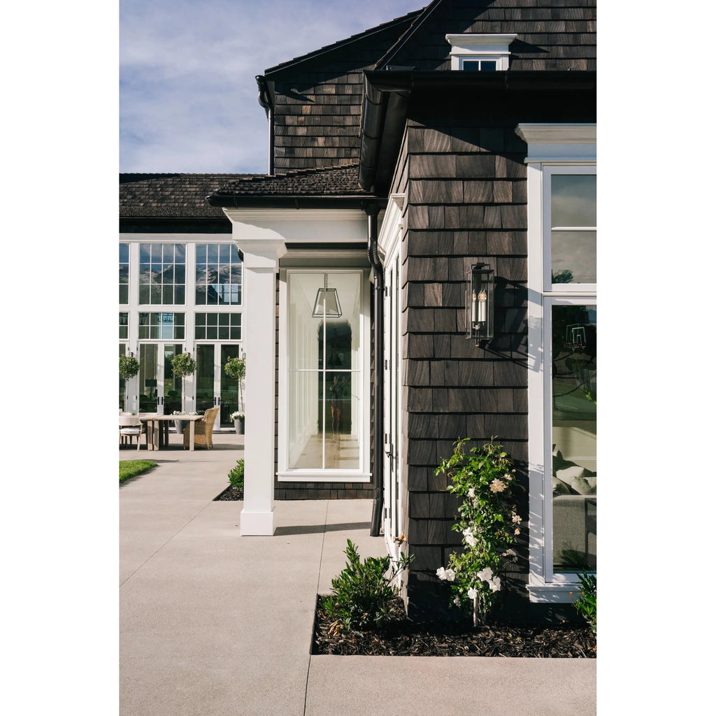 A slender, metal framework with clean, modern lines pairs with large panels of clear glass and classic candlestick bulbs to form this stately exterior wall sconce. The visible rectangular backplate reflects light beautifully and brings an added elegance to any outdoor setting.