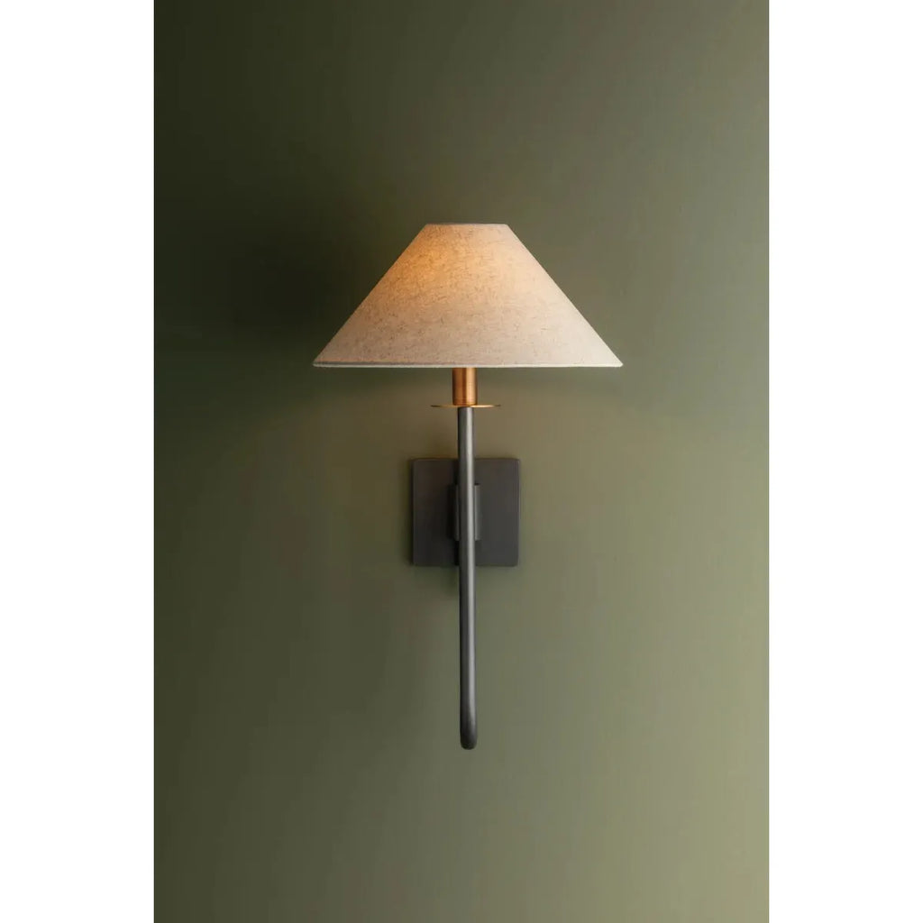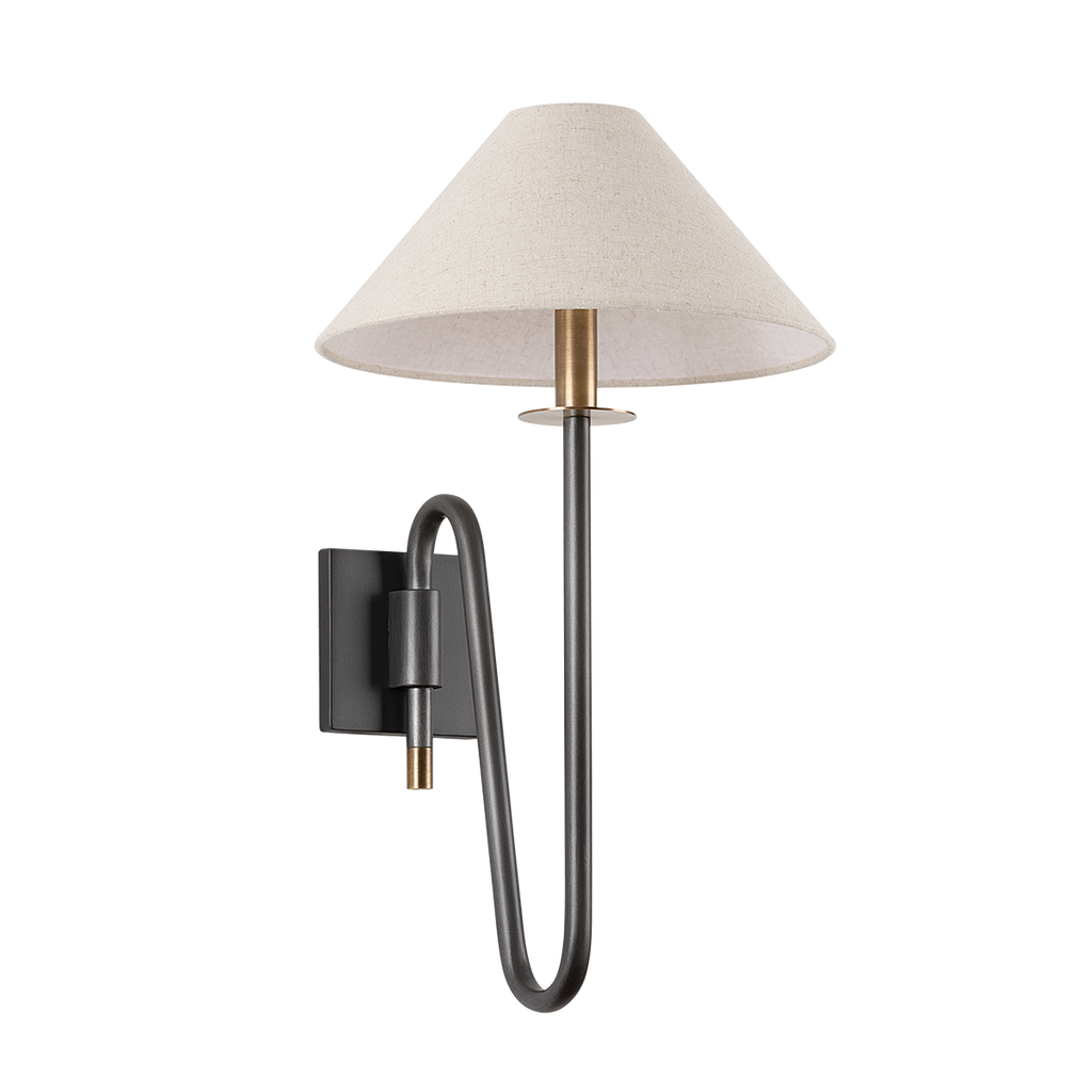 Inspired by the gestural curves of French designer Jean Royère’s work, the Mateo sconce makes a modern statement. Its deep, swooping arm culminates in a flourish on either end, drawing the eye. The mix of Graphite and Patina Brass finishes lends additional interest to the frame. Complemented by a natural linen shade, this design-forward fixture introduces a graphic edge to any space.