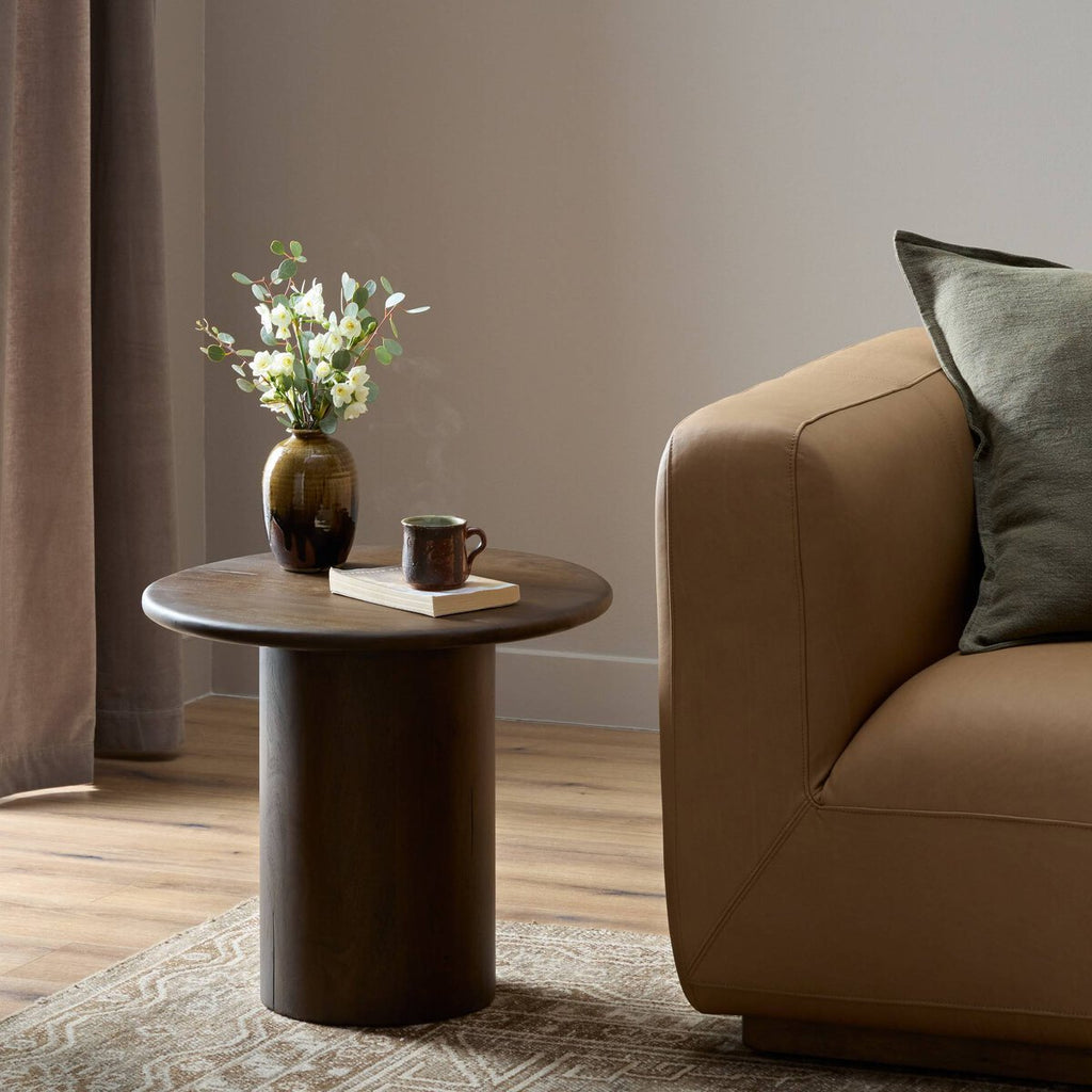 Add an elevated accent to any room with a rounded end table of mixed reclaimed woods finished in a rich, warm brown. Perfectly sized for your favorite book or drink or styled out with a vase of fresh flowers.