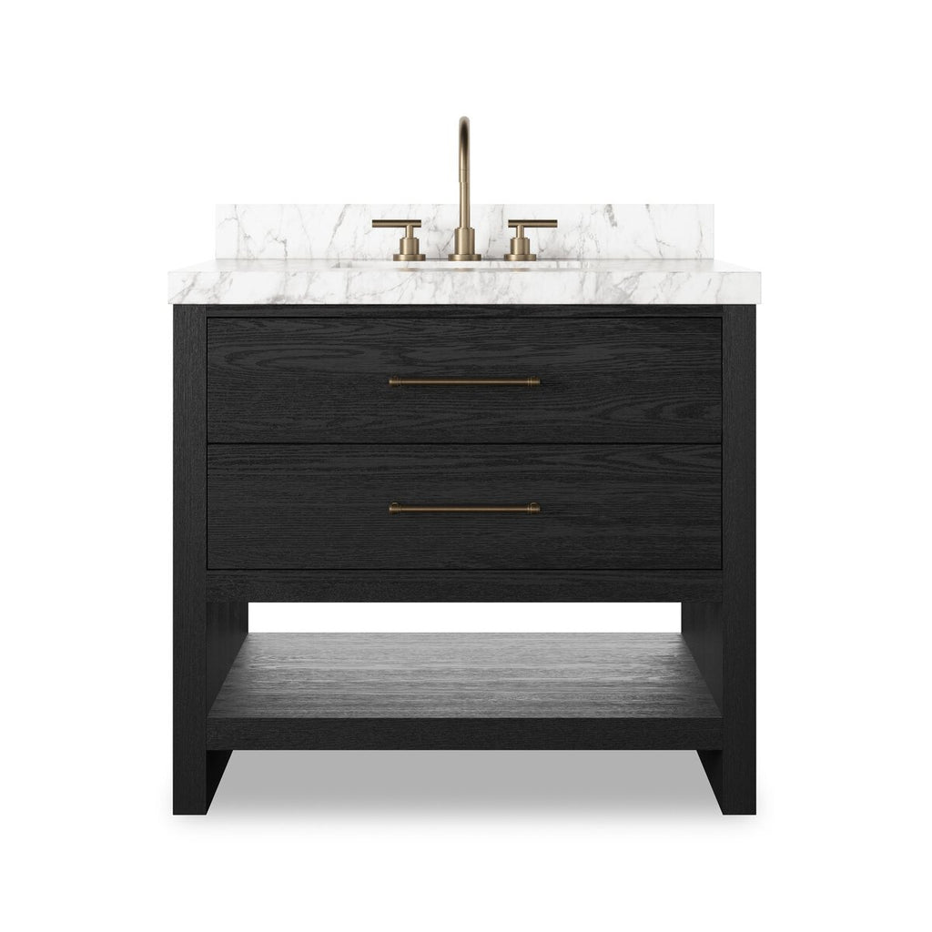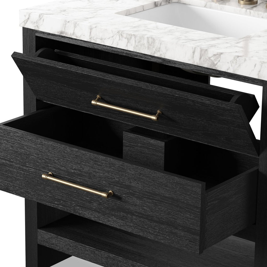 Set the tone for a calming, peaceful space with this simple, yet spacious design. Crafted with a wire-brushed, thick oak veneer base in a black wash finish for added character, a Carrara marble top and solid brass hardware. Includes one spacious drawer and open shelf below a tip-out drawer for a variety of storage and styling options. Finished with a bath-safe sealant for moisture resistance. Designed to accommodate 8”-widespread faucets and standard-size hardware for easy customization; faucet shown not included. Sink and backsplash included; backsplash ships separately. Removable back with cutouts for plumbing; fits standard P-trap. Professional installation required.