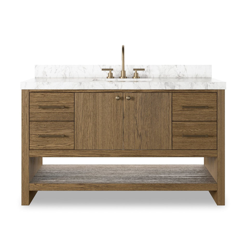 Set the tone for a calming, peaceful space with this simple, yet spacious design. Crafted with a wire-brushed, thick oak veneer base in a natural finish for added character, a Carrara marble top and solid brass hardware. A mix of drawers, cabinets and open shelving offers a variety of storage and styling options. Finished with a bath-safe sealant for moisture resistance. Designed to accommodate 8”-widespread faucets and standard-size hardware for easy customization; faucet shown not included. Sink and backsplash included; backsplash ships separately. Removable back with cutouts for plumbing; fits standard P-trap. Professional installation required.