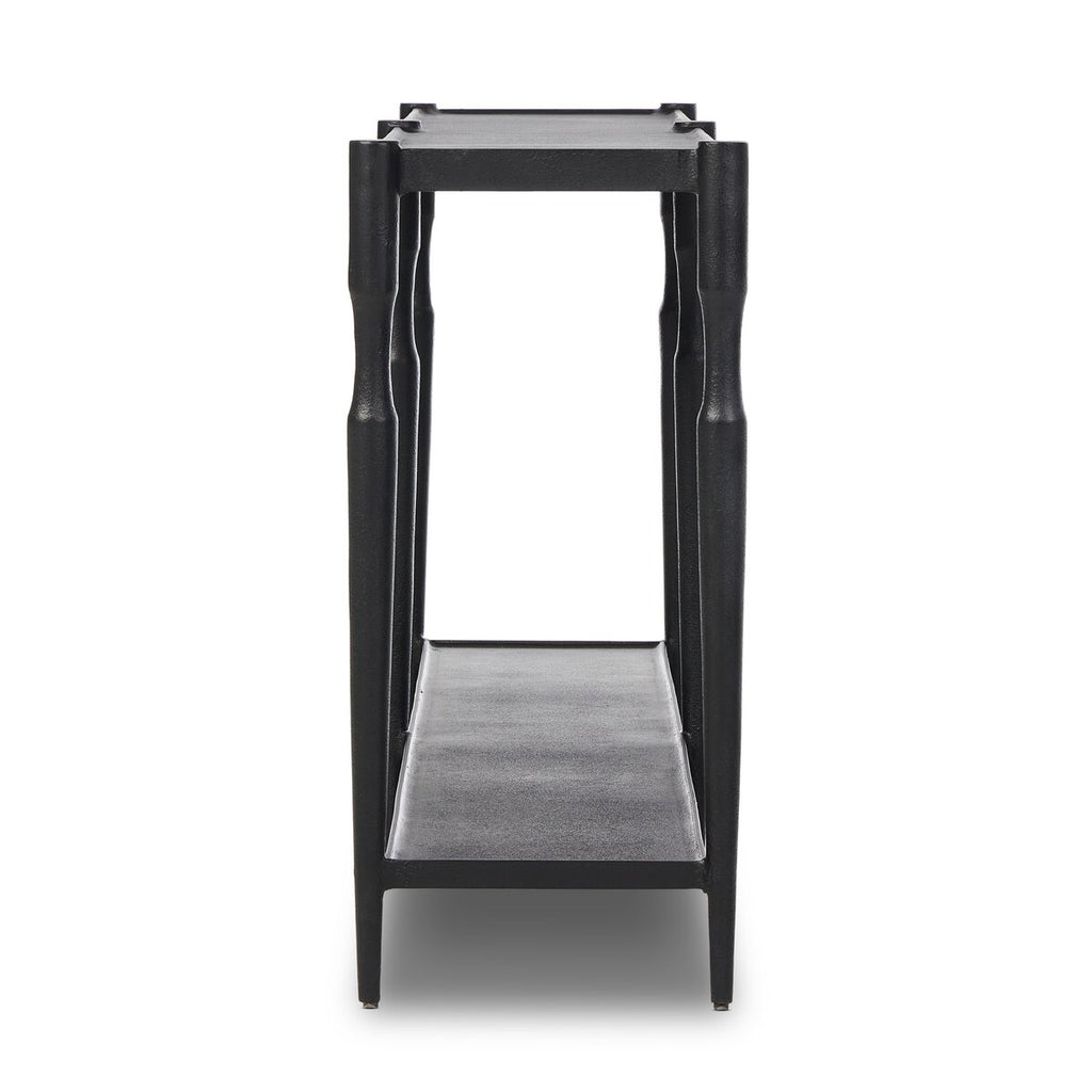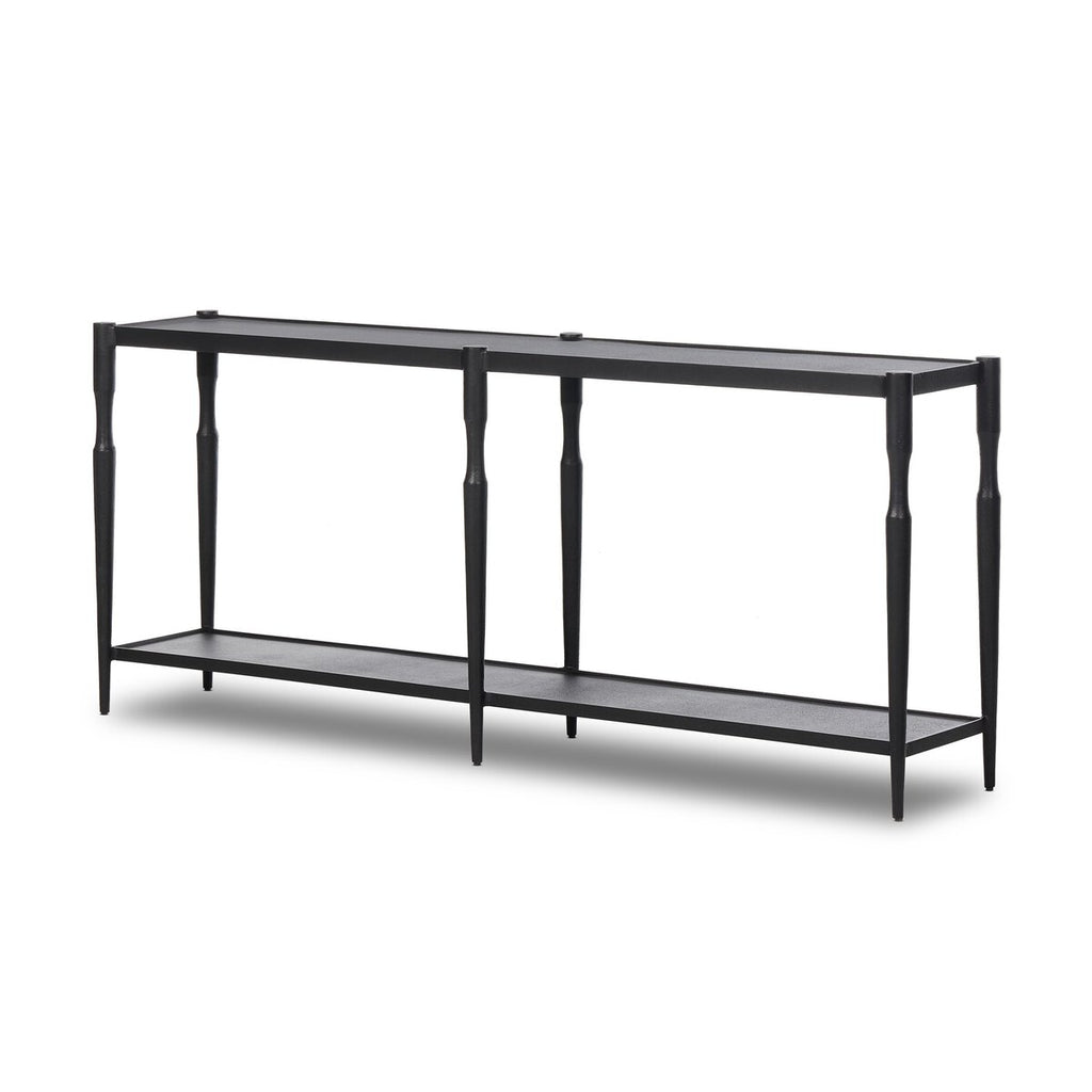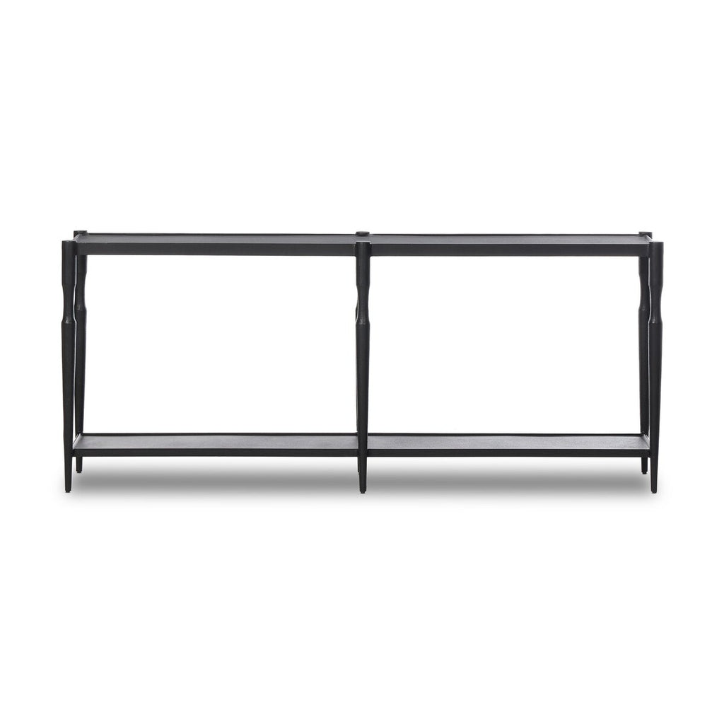 Simple and turned, textured cast iron legs shape a slim, open base for a tray-style top, with lower shelving for bonus storage and display. A classic black finish works into any space or style with ease. A design collaboration by Amber Lewis and Four Hands. This item has limited online distribution and may not be sold on websites without prior approval. Visit the FAQ page in our Help Center for more details.