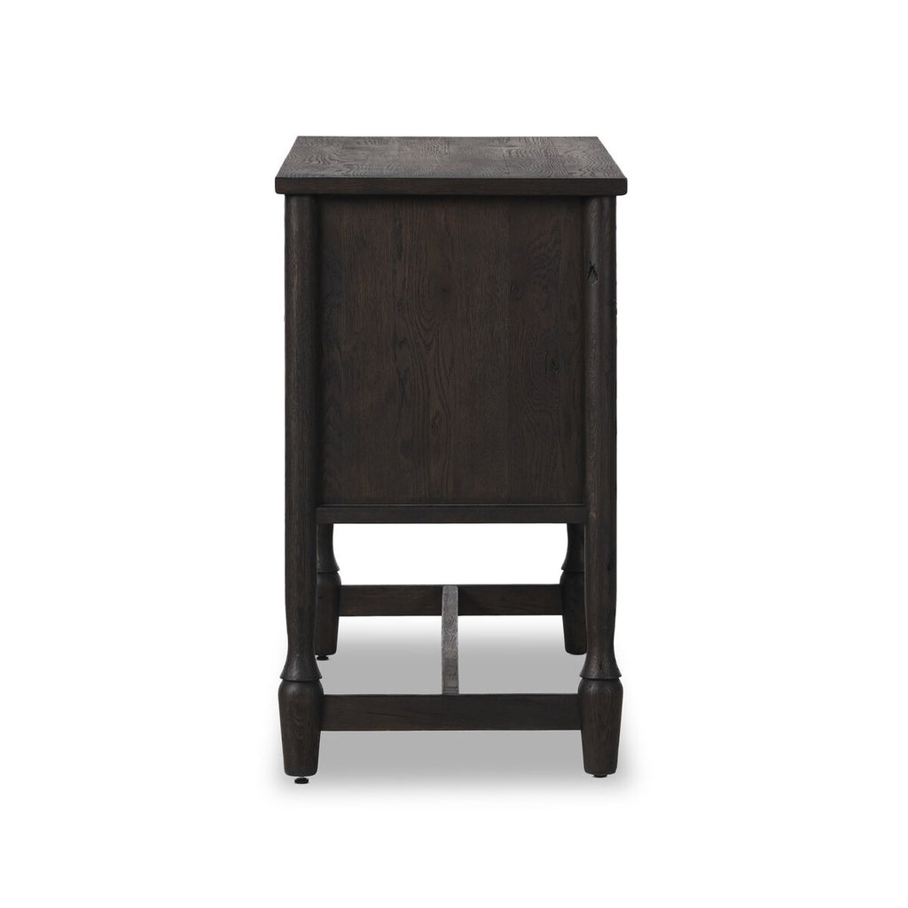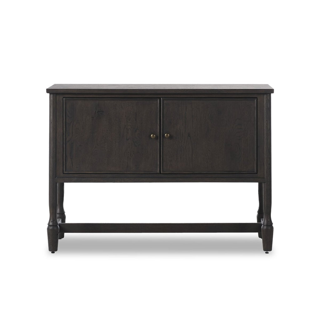 Small, rounded molding and turn shape legs — classic storage with an update. Two cabinet doors with bronze hardware conceal interior shelving for a storage solution in smoked black oak. A design collaboration by Amber Lewis and Four Hands. This item has limited online distribution and may not be sold on websites without prior approval. Visit the FAQ page in our Help Center for more details.