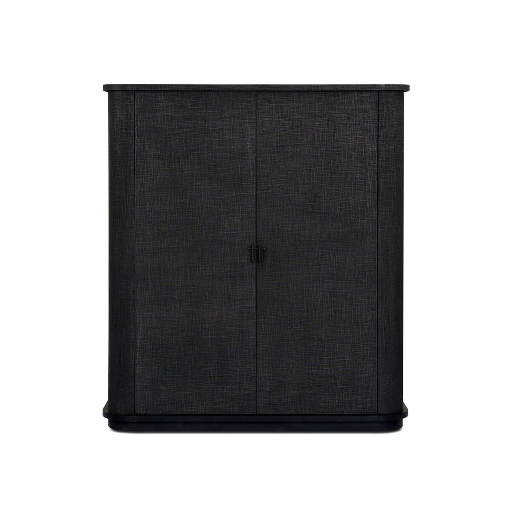 A story of material and shape, this large-scale cabinet finds softness in rounded sides and black linen wrapping. Finished with a pin-and-chain latch detail for added character.