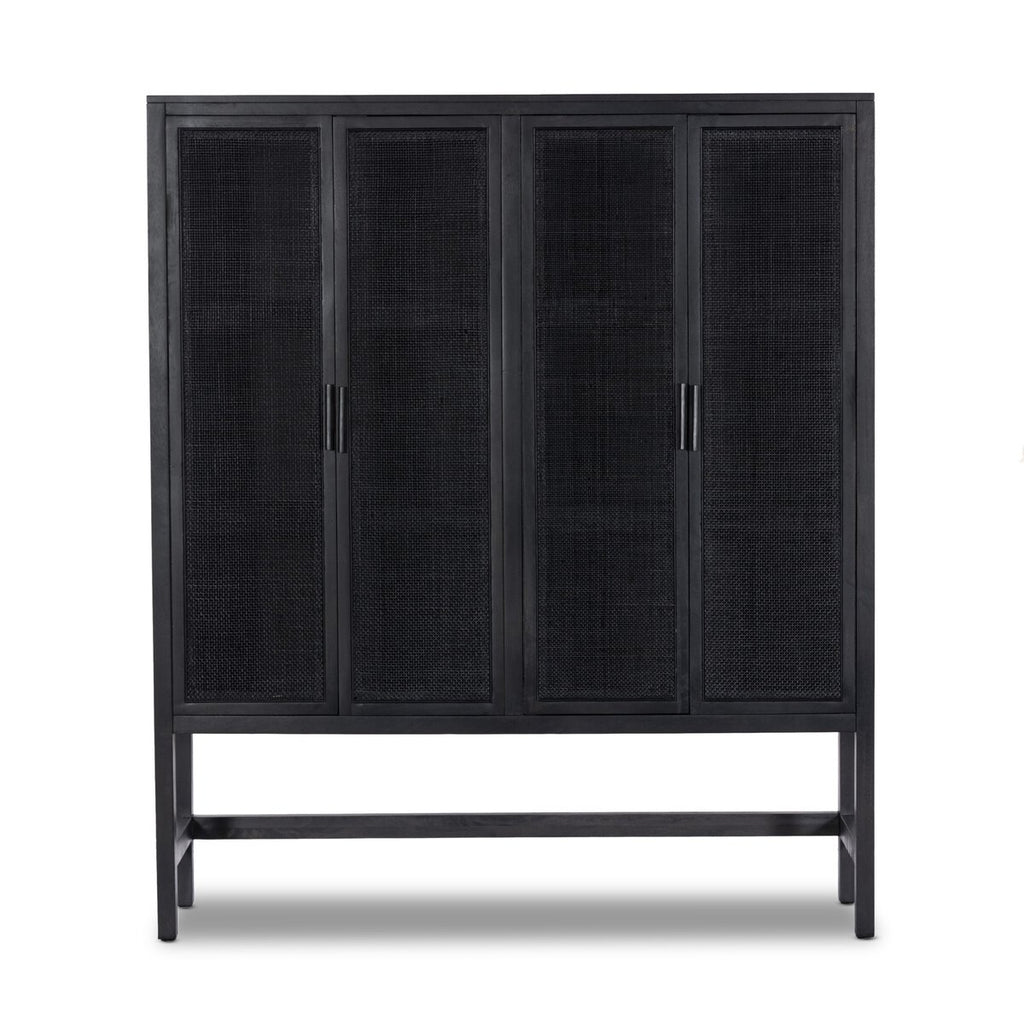 Talk about texture. Washed black mango forms spacious open shelving, with woven door fronts of natural cane for eye-catching contrast and a fashion-forward feel.