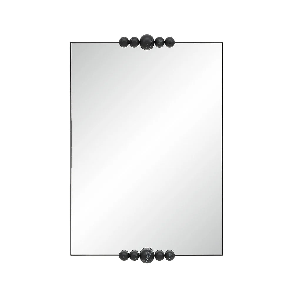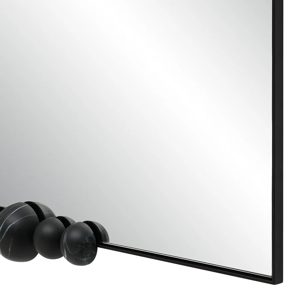 Bring bold character to any modern interior with the Cosmos wall mirror. Its matte black iron frame delivers clean, architectural appeal, while the crystal-clear glass ensures a true, seamless reflection. Accented with sculptural black marbled half-spheres, it introduces subtle artistry and texture. Both stylish and durable, this mirror enhances contemporary spaces with effortless sophistication.
