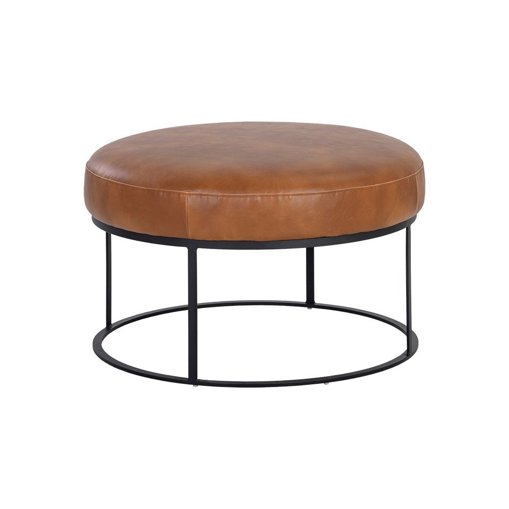 This round ottoman designed with modern elements will be the perfect additional seat or footrest in living and lounge spaces. Stocked in moto stucco fabric, and overcast grey or tobacco tan faux leather with a black iron frame. Handle With Care: This design has been crafted with faux leather. Faux leather is manufactured to reflect the natural characteristics of leather; as such, colour variations, markings wrinkles, grooves, and light scratches are appreciated characteristics. No two pieces will be alike.