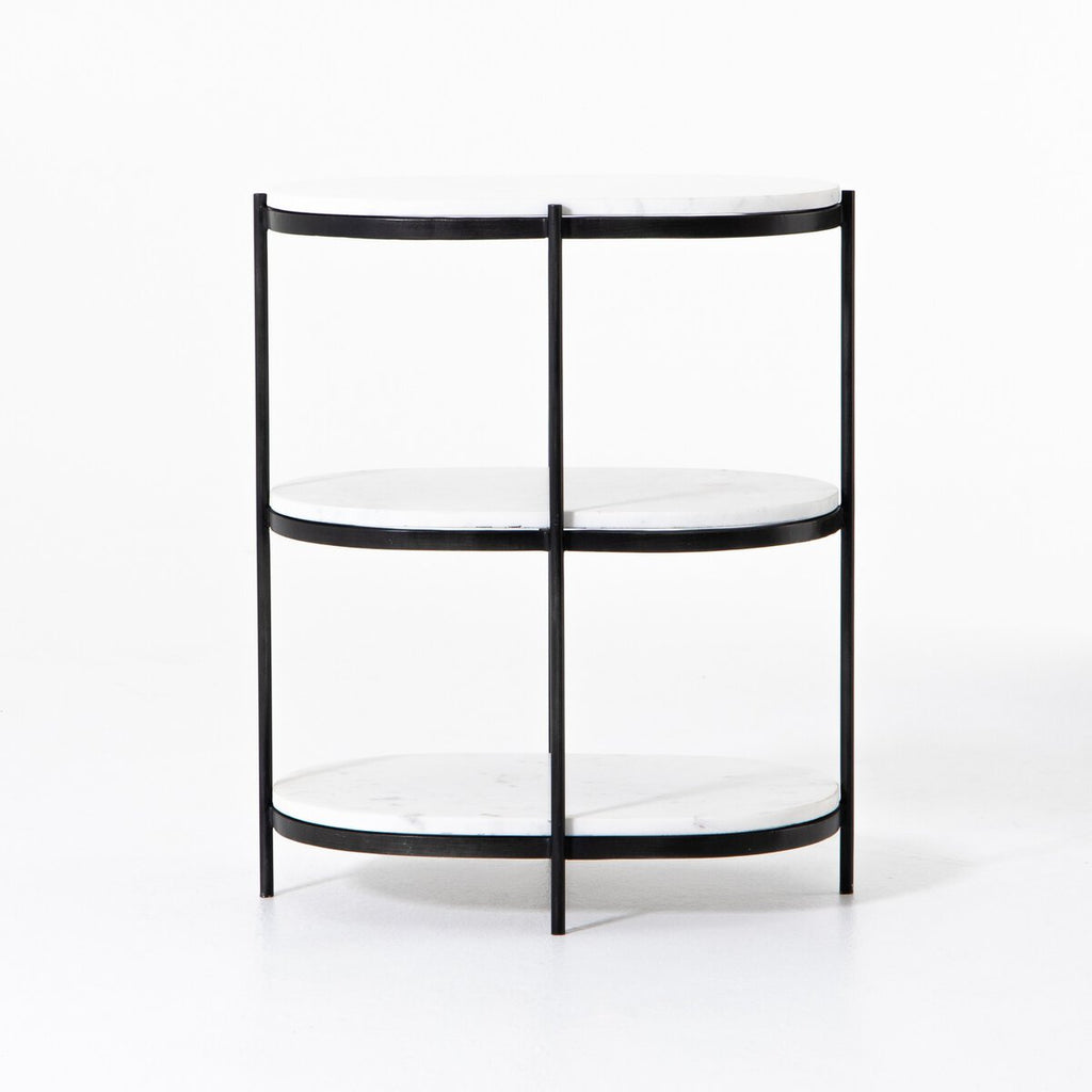 Add a pop of sophistication to any space. Polished white marble lays three tiers of oval-shaped shelving, with powder-coated grey iron framing bringing a feminine feel to bedside storage.