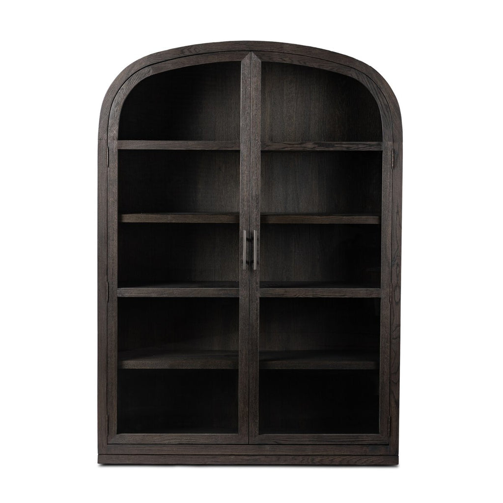 With rounded sides inspired by Eighties design, dark-finished oak brings depth into any room in your home. Spacious shelves create endless storage and display options for favorite books and keepsakes, all visible through clear tempered glass.