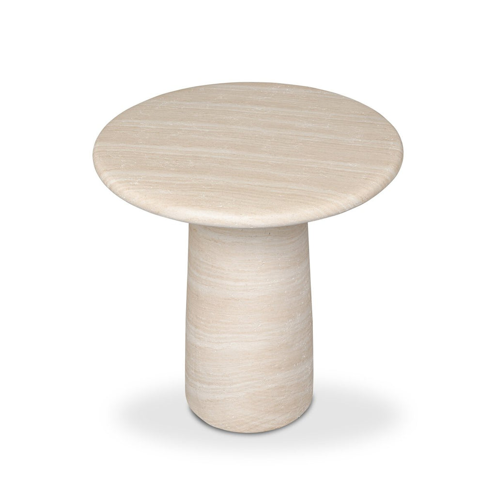 A dome-shaped pedestal base supports a rounded tabletop with bullnose edges. Made from cast concrete with a water-transfer finish which resemble natural stone.