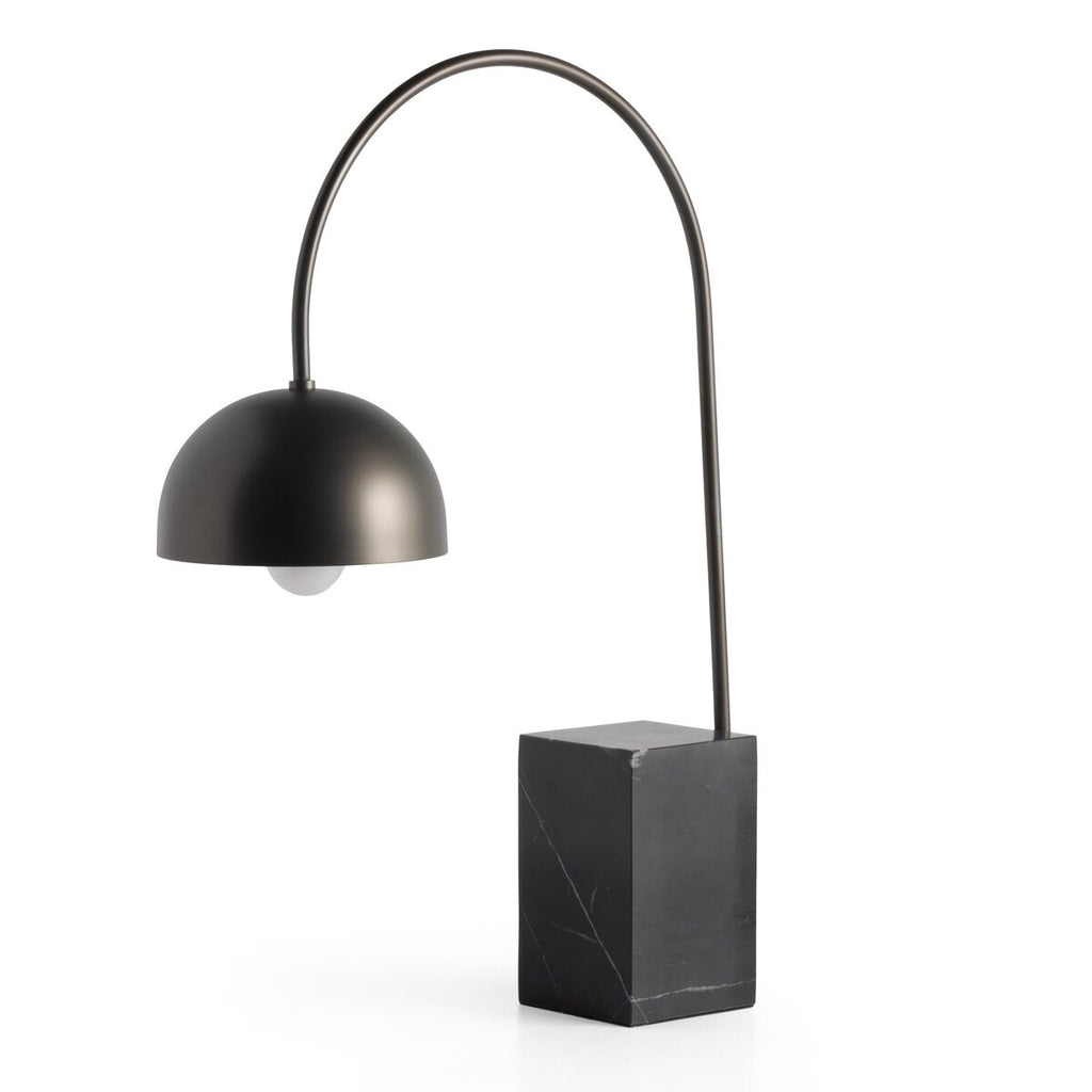 Soft and sculptural. A rectangular base of solid black marble grounds a beautifully arched task lamp of dark antique iron.