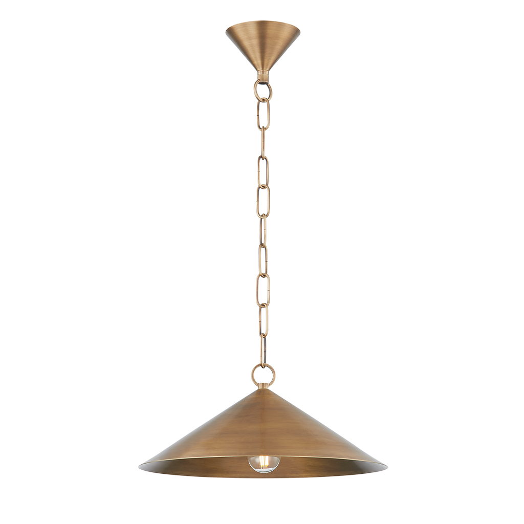 A straightforward conical shade is complemented by a similarly shaped canopy or backplate. The hard lines of the cones are broken up by graceful linked metalwork that draws the eye and makes the fixture feel unique. Both the pendant and wall sconce are lit from within by a single small bulb for a beautiful, soft lighting effect. The familiar silhouette and gorgeous warm tones of the Patina Brass make Midvale feel comfortable in just about any interior.