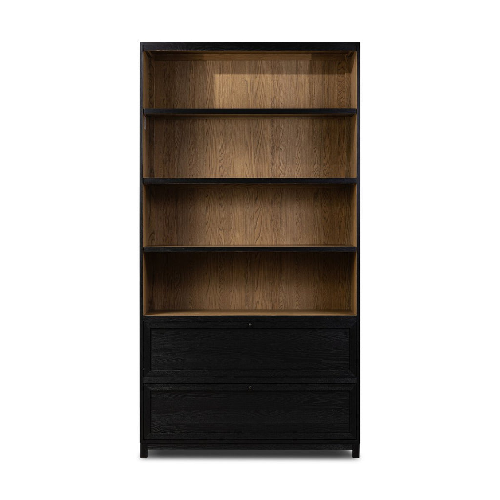 Black drifted oak frames lighter interior shelving, for eye-catching contrast. Four surfaces to showcase favorite books and treasures, while lower drawers bring bonus space to store items out of sight.