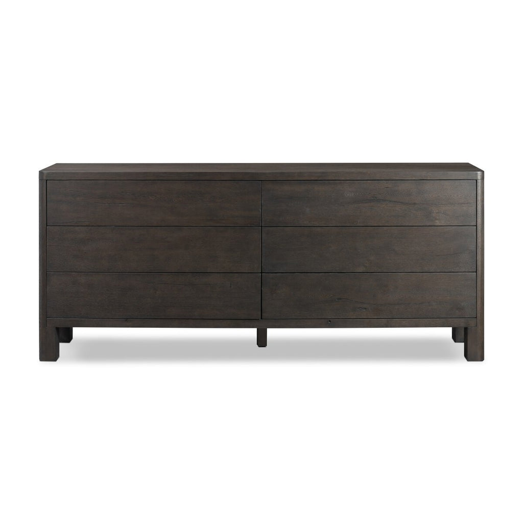 ed with a thick plank of solid oak, this extra-wide dresser blends modern lines and warm character with six roomy drawers, slightly curved corners, and solid square legs. Seamless drawer fronts have a push-latch mechanism. Made from solid oak and veneer in a smoky black finish.