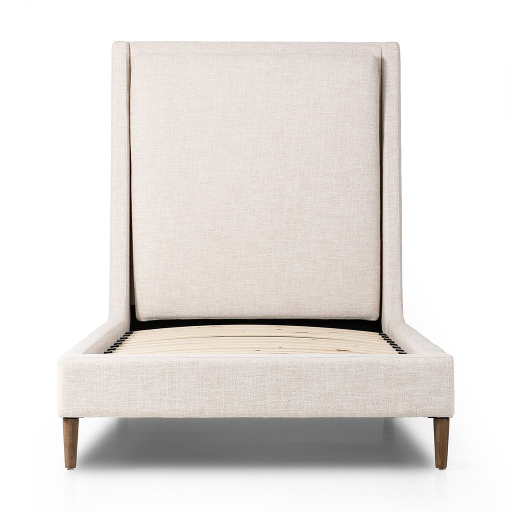 Welcome light, livable luxury into your bedroom with a fully upholstered bed. A tapered headboard features a fixed oversized cushion of high-performance fabric, creating a soft, layered look. Understated wooden legs complete the design. Performance fabrics are specially created to withstand spills, stains, high traffic and wear, ensuring long-term comfort and unmatched durability.