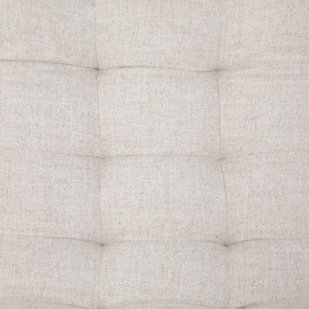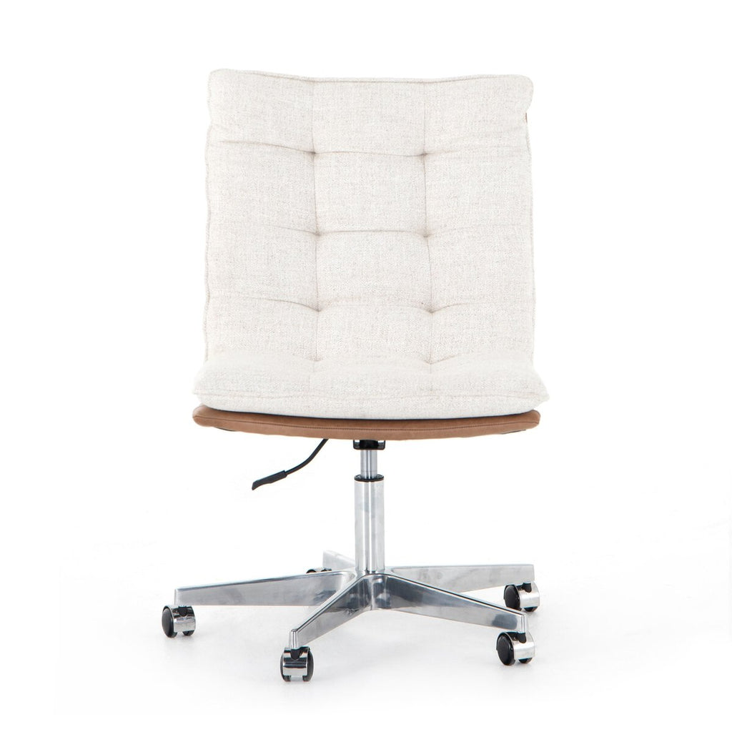 A fashion-forward material mix makes for fun, hip vibes. With shallow tufting for texture, cream linen-blend seating tops a back of tan top-grain leather, with a stainless steel base, casters and seat adjustability for total ease in the modern office.