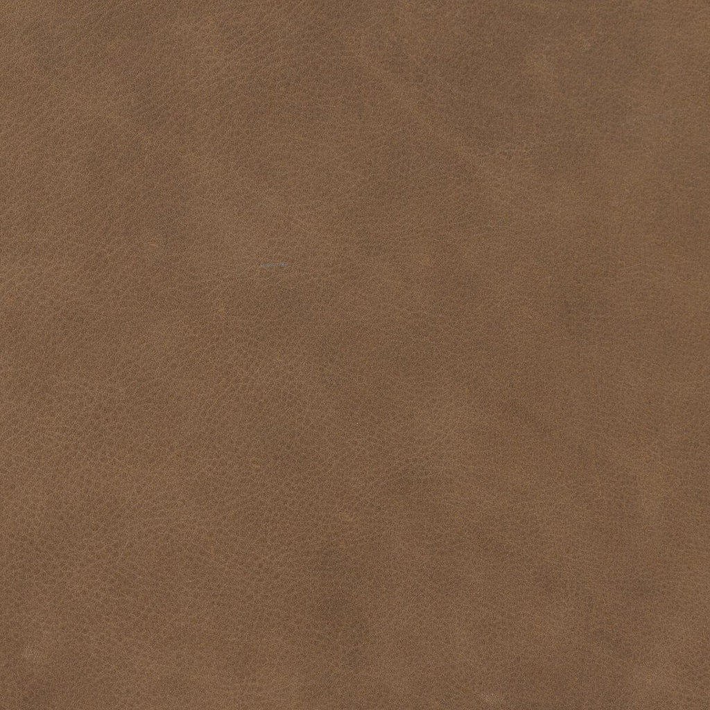 Rounded, chunky dowel legs in an amber oak finish frame the neutral, top-grain leather headboard of this bed frame.