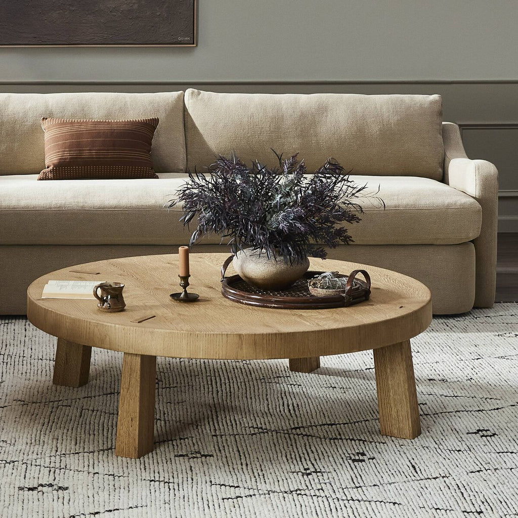Large-scale Swedish folk inspiration. This coffee table comes in a beautifully distressed, thick oak veneer — the perfect bold, antiqued living room centerpiece. Pull-through legs show exposed joinery for an authentic look. A design collaboration by Amber Lewis and Four Hands. This item has limited online distribution and may not be sold on websites without prior approval. Visit the FAQ page in our Help Center for more details.
