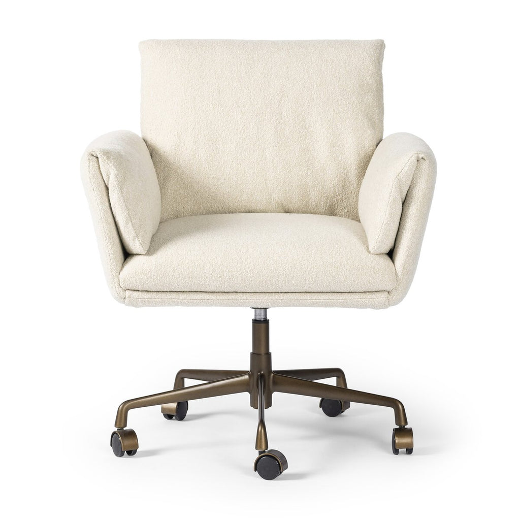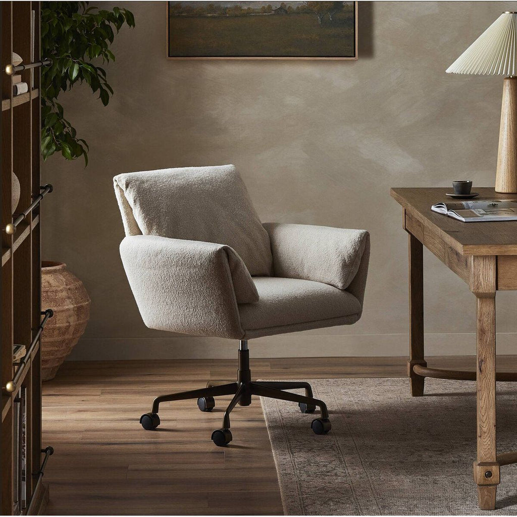 An off-white linen desk chair pairs an inviting backrest and fold-over seat. 360-degree swivel feature and rolling casters for effortless mobility.