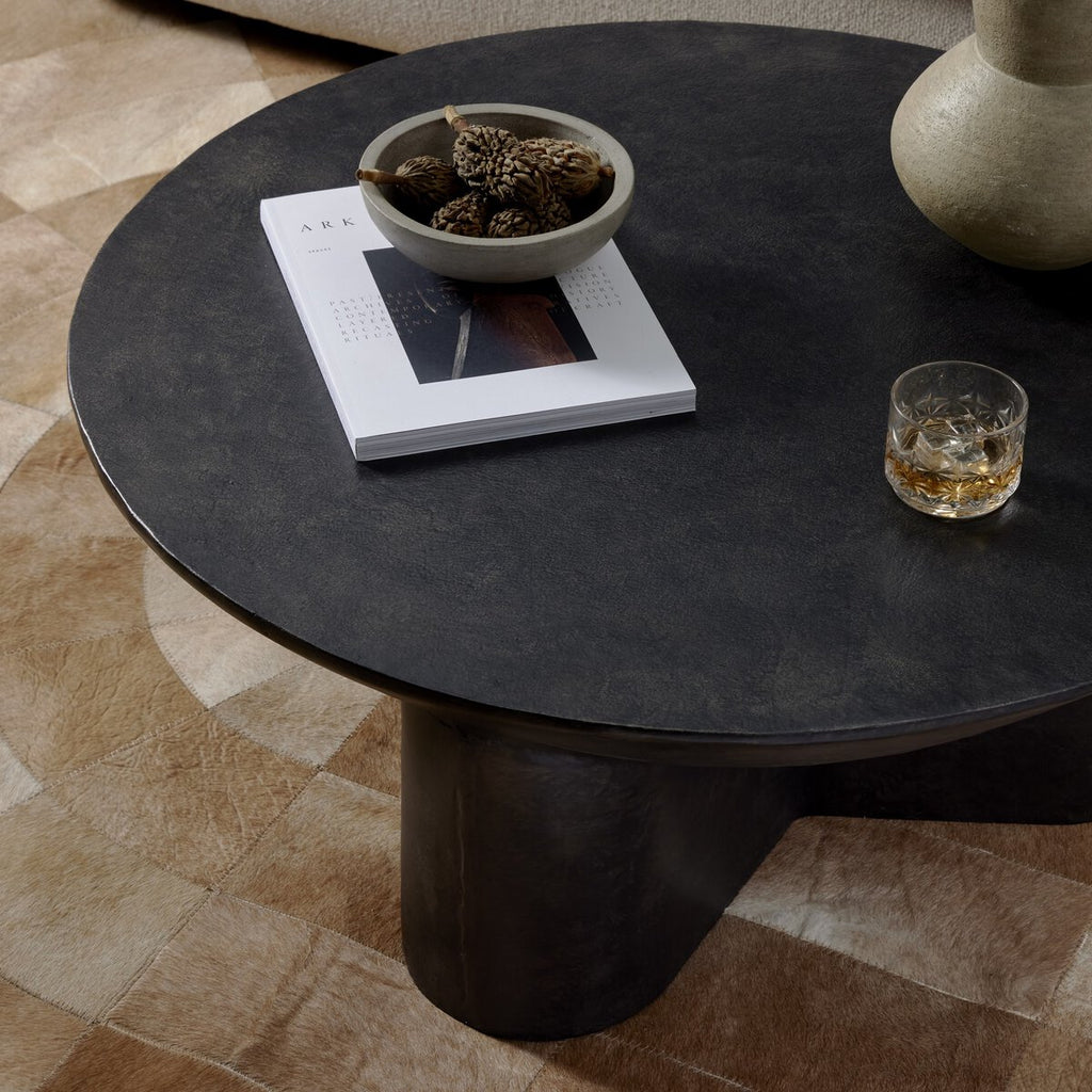 Made from cast aluminum with a raw black finish, a soft, voluminous Y base supports a drum-style tabletop with natural highs and lows.
