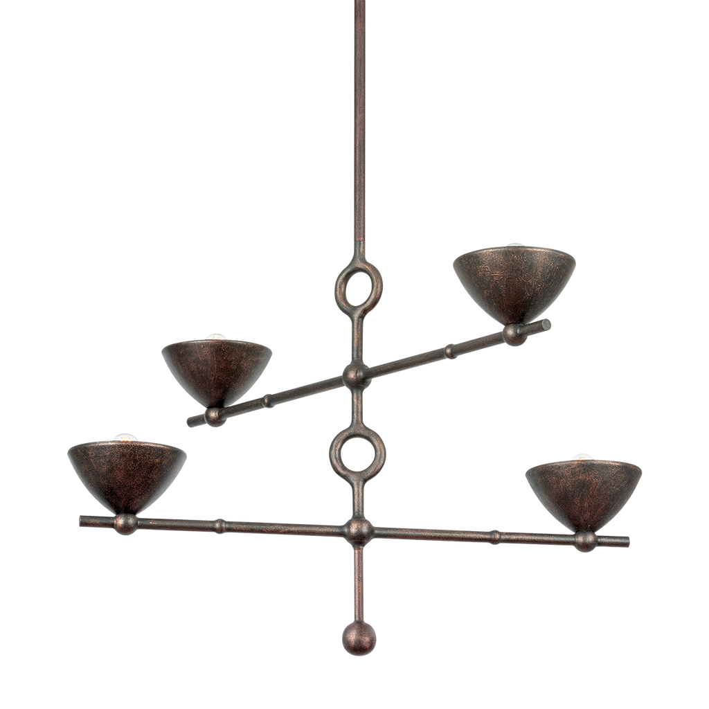 Inspired by the work of renowned Italian artist Alberto Giacometti, the Vishal family makes an impact with its sculptural framework and heavily patinated finish. The shades resemble dishes filled with light while the spindly arms are accented by ornamental circular motifs. The allover Black Patina Gold finish continues the art historical reference, adding an organic, hand-applied, and weathered effect. Vishal is available as a 1-light sconce and 4 or 6-light chandelier.