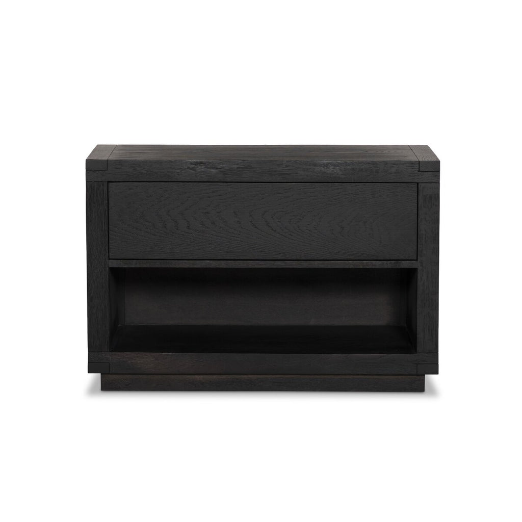 Solid acacia shapes a streamlined box-style nightstand, with lap joint corners for a detail-driven touch. Finished with smooth, push-latch drawer glides.